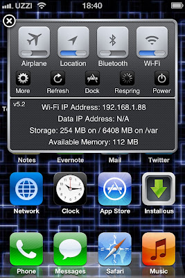 SBSettings is a tweak that adds a drop down bar that gives users access to shortcuts to essential system functions such as Wifi and Airplane mode. The shortcuts displayed on the drop down bar can be custom selected from an extensive list by the user. Other shortcuts include Location Services, Bluetooth, 3G, Brightness, Mobile Data, Processes - you get the picture. SBSettings also provides an extra dock for more application placements and has extra functions underneath the users selected shortcuts which includes a Respring button and more power options which allow users to reboot, power off, enter safe mode or lock the screen. Also, there is additional system information listed underneath the shortcuts which displays the Wifi IP address, Data IP address and Storage Information.