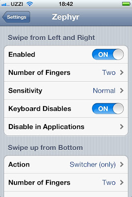 Zephyr brings iPad multitasking gestures to the iphone, the only difference is that Zephyr enables users to choose how they want to multitask. When installed, Zephyr does not sit on the homescreen, instead it can be accessed through settings. Within Zephyr, users can select the number of fingers to use when performing gestures (I recommend two), the level of sensitivity of the gestures can be adjusted, the switcher delay time can be changed to the users preference and users can disable gestures in any blacklisted application to prevent gestures from clashing with open applications.