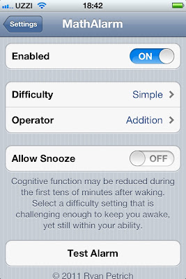 MathAlarm+ is a very simple but effective jailbreak tweak. It basically is an Alarm (obviously) that requires the user to solve a mathematical problem to disable it. A very simple concept but it really does work. This tweak is not added as an application to the homescreen but instead can be found in settings. The difficulty of the mathematical problem can be adjusted, the four difficulty settings that can be selected are simple, easy, normal or hard. You also have a selection of operators which includes addition, subtraction, multiplication and division. After selecting your options you can test the alarm. Let me warn you that without a snooze button there is no way to disable the alarm but to solve the problem so I suggest you start from the simple difficulty setting and move up from there (this problem may have been addressed in the latest version).
